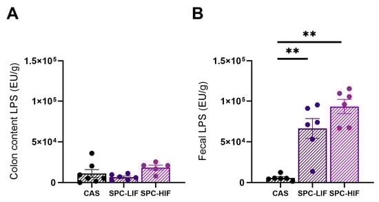 3.5. The Effect of SPC-LIF and SPC-HIF Diets on LPS Concentration in Colon Content and Fecal Samples