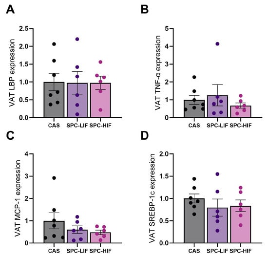 Because of the close proximity of VAT to the liver and GI tract, we measured LBP, TNF-α, and MCP-1 expression in VAT samples to determine any potential involvement of VAT in LPS-mediated inflammation and the anti-inflammatory effect of SPC. There were no differences in LBP, TNF-α, or MCP-1 expression in VAT between any groups (Figure 6A–C). We also measured the expression of a lipogenesis marker SREBP-1c in VAT and detected no significant differences in SREBP-1c expression levels between any groups (Figure 6D).