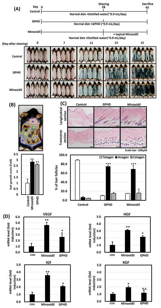 GPHD promotes hair growth in mice. (A) Six-week-old mice were fed a normal diet and distilled water (~0.9 mL/day) or GPHD, while the minoxidil group was fed a normal diet and distilled water (~0.9 mL/day) with an additional topical application of minoxidil for 15 days before being sacrificed. Images show hair growth progression on mouse dorsal skin on day 0, 7, 11, 13, and 15 after depilation. (B) Hair growth score was calculated in the following way: Hair growth score = (Area of A × 0) + (Area of B × 1) + (Area of C × 2)/total area. (C) H&E staining of mouse dorsal skin sections showed morphological changes in hair follicles and quantitative histomorphometry showed changes in hair cycle phases following treatment with minoxidil and GPHD. (D) Growth factors in each mouse group’s dorsal skin tissue were analyzed by real-time PCR. The results shown are representative of three independent experiments. p-value < 0.05 was considered statistically significant; individual p-values (* p < 0.05; ** p < 0.005; *** p < 0.0005) are indicated. n.s; not significant.