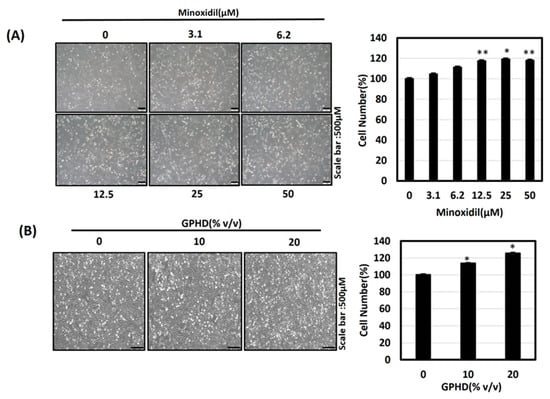 To explore the therapeutic effects of G. Pentaphyllum in vitro, the culture medium containing GPHD referred to in Materials and Methods was made. We also examined the effects of damulin B, a hydroxylated dammarane-type glycoside, as the analysis of GPHD via ultra-high performance liquid chromatography–quadrupole/time-of-flight mass spectrometry (UHPLC-Q/TOF MS) had previously shown it to be a predominant component [34]. Human dermal papilla cells (hDPCs) were treated with the indicated concentration of minoxidil (Figure 2A), GPHD (Figure 2B), and damulin B (Figure 2C,D) for 24 h. A trypan blue cell counting assay revealed the cell-proliferative effects of each reagent, while no toxicity was observed (Figure 2E).