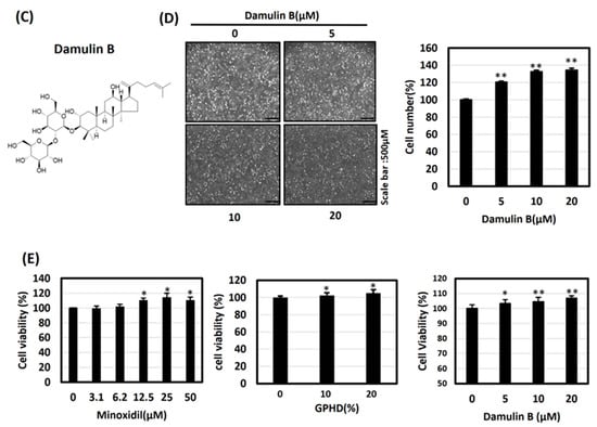 Minoxidil, GPHD, and damulin B enhance the proliferation of human dermal papilla cells (hDPCs). hDPCs were treated with the indicated concentration of minoxidil (A), GPHD (B), and damulin B (D) for 24 h, and cell numbers were measured. Microscopic images of hPDCs were taken and cell numbers were examined via trypan blue cell counting assay. (C) Chemical structure of damulin B. (E) MTT assays were performed under identical conditions. The results shown are representative of three independent experiments. p-value < 0.05 was considered statistically significant; individual p-values (* p < 0.05; ** p < 0.005) are indicated.