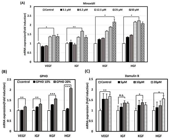 Minoxidil, GPHD, and damulin B induce the expression of growth factors in hDPCs. hDPCs were treated with minoxidil (A), GPHD (B), and damulin B (C) for 24 h in a concentration-dependent manner. Then, real-time PCR was performed to measure the mRNA level of each growth factor. The results shown are representative of three independent experiments. p-value < 0.05 was considered statistically significant; individual p-values (* p < 0.05; ** p < 0.005; *** p < 0.0005) are indicated. n.s; not significant.
