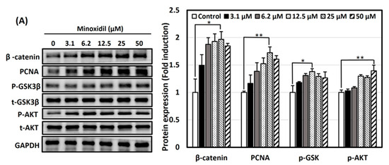 An immortalized human dermal papilla cell (hDPC) line retaining the characteristics of primary DPCs was used for the current study [32,33]. This cell line expresses alkaline phosphatase, versican, alpha-smooth muscle actin, and biglycan. Human dermal papilla cells were maintained in Dulbecco’s modified eagle medium (DMEM) (Gibco, Grand Island, NY, USA) supplemented with 10% heat inactivated fetal bovine serum (Corning, NY, USA) in humidified air containing 5% CO2 at 37 °C. Antibodies against GAPDH and PCNA were purchased from Santa Cruz Biotechnology (Santa Cruz, CA, USA). Antibodies against β-catenin, GSK3β, P-GSK3β (Ser9), AKT, and P-AKT(Ser473) were purchased from Cell Signaling Technology (Danvers, MA, USA). Damulin B was obtained from ChemFaces Biochemical (Wuhan, China). Commercially available 5% minoxidil was used for in vivo experiments.