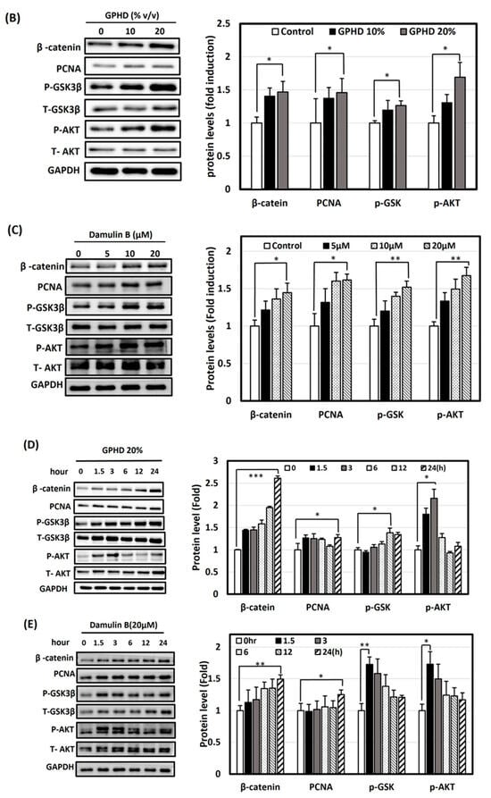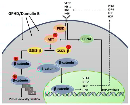 Studies have suggested a focal role of the Wnt/β-catenin signaling pathway in follicle cycling and hair morphogenesis in embryonic and adult life [38,39]. Additionally, studies have suggested that minoxidil activates the β-catenin pathway in dermal papilla cells to prolongate the anagen phase in the hair follicle cycle [40]. It is widely acknowledged that β-catenin induces the transcription of genes associated with cellular proliferation, encompassing diverse growth factors; hence, its deficiency within dermal papilla cells can disrupt the niche, hindering hair growth [41]. Thus, we focused our study on the Wnt/β-catenin signaling pathway as a plausible mechanism of hair growth-promoting activity. Minoxidil, GPHD, and damulin B induced the expression of β-catenin in a concentration- (Figure 4A–C) and a time-dependent manner (Figure 4D,E) in hDPCs. GSK3β in its active, non-phosphorylated state is responsible for the ubiquitination of β-catenin. However, an elevation in the expression of phosphorylated GSK3β-Ser9, indicating its inactive form, was observed, suggesting the stabilization of β-catenin. Several studies have emphasized the significance of phosphoinositide 3-kinase and the AKT (PI3K/AKT) pathway in the maintenance, proliferation, and even de novo synthesis of hair follicle regeneration [20,42,43]. Our results demonstrated that the level of phosphorylated AKT, which mediates the signals of various growth factors, was also significantly increased by these reagents [44]. Notably, significantly elevated expression of the proliferation marker proliferating cell nuclear antigen (PCNA) was observed in the presence of minoxidil, with a modest increase noted in the presence of both GPHD and damulin B, indicating the induction of DNA synthesis. Collectively, these results suggest that minoxidil, GPHD, and damulin B induce cell proliferation through similar mechanisms of activating growth factors and the β-catenin signaling pathway (Figure 4).