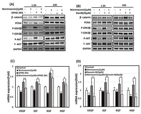 Next, we investigated whether the Akt signaling pathway is directly involved in the induction of β-catenin. Results from the time-dependent experiment indicated a notable increase in the expression of P-AKT and P-GSK3β during the initial exposure (1.5 h) to GPHD and damulin B. In contrast, the expression of β-catenin was observed at a later time point (24 h), as depicted in Figure 4D,E. Based on these temporal patterns, we suspected that Akt may act as an upstream of β-catenin. GPHD- and damulin B-induced Akt activation, the phosphorylation of GSK-3β, and induction of β-catenin were significantly blocked when hDPCs were pretreated with wortmannin, a specific inhibitor of PI3-kinase (Figure 5A,B). However, the expression level of PCNA was hardly affected by wortmannin, indicating that PCNA induction is not directly regulated via PI3-kinase and the Akt signaling pathway. The expression level of growth factors was also significantly suppressed by wortmannin under the same condition (Figure 5C,D). These results indicate that the following signaling cascade is activated in hDPCs: GPHD and damulin B activate the PI3-kinase/Akt pathway, which induces β-catenin, which in turn activates the transcription of various growth factors.