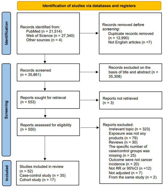 The inclusion criteria were as follows: (1) case–control or cohort studies; (2) studies that reported the specific number of cases and participants in each category; (3) studies that evaluated the association between the consumption of soy foods and the risk of cancer; (4) studies that presented adjusted odds ratio (OR), relative risk (RR), or hazard ratio (HR), as well as 95% confidence intervals (95% CI). Review articles, letters, animal research articles, and a range of other studies that could not be used for statistical analysis, as well as non-English studies, were excluded. If there was more than one article from the same study, the latest one was selected. The detailed process of study selection is shown in Figure 1.