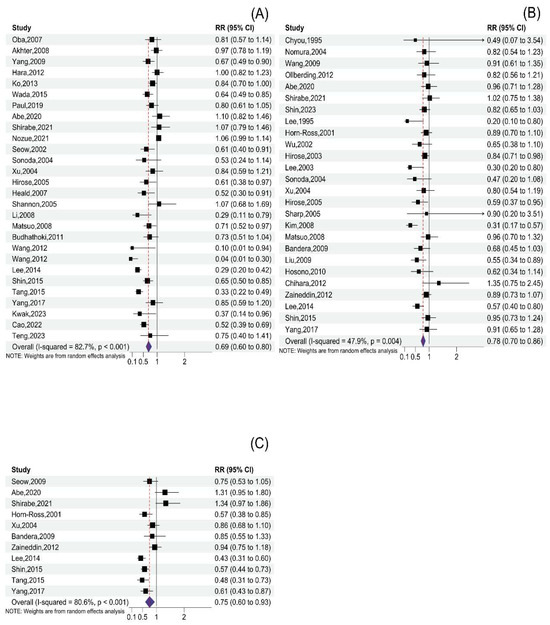 The pooled adjusted RRs and their 95% CIs of cancer risk for the highest compared with the lowest consumption categories, comprising total soy products, tofu, miso soup, fermented soy products, soymilk, soy paste, natto, and non-fermented, was used to assess the effect of high consumption of these soy products on cancer risk using the DerSimonian and Laird random effects model, which considers both within-study and between-study variations [33]. ORs and HRs were considered equivalent to RRs. If a study reported separately by gender [15,16,17,18,20,34,35,36,37,38,39,40,41], different ages [42,43], menopausal status [14,44], smoking [45], cancer type [46], EGFR mutation [16], or BRCA mutation [47], the overall estimate was obtained by the fixed-effect model before merging them with other studies. Subgroup analysis was conducted by cancer type (gastrointestinal cancer, gynecological cancer, upper aerodigestive tract cancer, prostate cancer, lung cancer, bladder cancer, liver cancer, multiple myeloma, non-Hodgkin lymphoma, and leukemia). Subgroup analyses also stratified the data by sex, study design (case–control study, cohort study), and geographic location (China, Japan, Korea, Singapore, Europe, USA). Meta-regression analysis was used to explore possible heterogeneity between studies further. Statistical heterogeneity among studies was determined using the Q test and I2 statistic. I2 values > 50% were considered high heterogeneity [48].