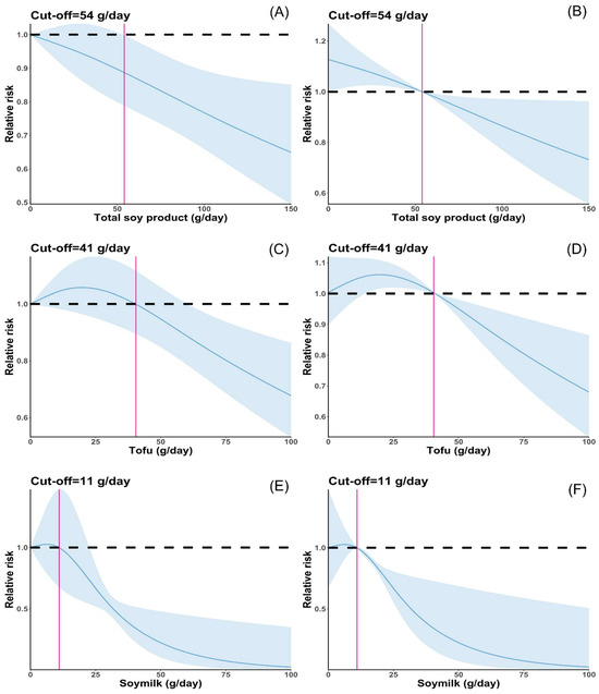 A total of 8269 cases and 177,626 participants in eleven studies (eight case–control studies and three cohort studies) reported soymilk consumption. In the pooled estimates, high consumption of soymilk was inversely associated with cancer risk (the highest versus the lowest category) (RR: 0.75; 95% CI: 0.60, 0.93), and the heterogeneity among studies was high (I2 = 80.6%, p < 0.001) (Figure 2C, Table 2). In case–control studies, increased consumption of soymilk showed an inverse association with cancer risk (RR: 0.65; 95% CI: 0.52, 0.80), but no association was found in cohort studies (RR: 1.10; 95% CI: 0.76, 1.58), and the type of study design was a source of heterogeneity (p-difference = 0.031). According to the sex stratification, no significant association was found (p-difference = 0.699). By cancer type, significant associations were detected for gastrointestinal cancer (RR: 0.58; 95% CI: 0.47, 0.72), ovarian cancer (RR: 0.43; 95% CI: 0.31, 0.6), and upper aerodigestive cancer (RR: 0.48; 95% CI: 0.31, 0.74), but not for gynecological cancer (breast and endometrial), lung cancer, or liver cancer, and there was no statistical difference in meta-regression analysis (p-difference > 0.05 for all comparisons). Based on geographic location, soymilk consumption was found to be inversely associated with cancer risk in China (RR: 0.57; 95% CI: 0.35, 0.93) and Korea (RR: 0.58; 95% CI: 0.47, 0.72), while not in the USA, Singapore, or Europe. In contrast, soymilk consumption showed a positive association with cancer in Japan (RR:1.32; 95% CI:1.05, 1.66). However, a statistical difference was only observed between Korea and Japan (p-difference = 0.035), but not between China and Japan (p-different = 0.068). Six studies [15,61,72,73] were included in the dose–response between soymilk consumption and cancer risk, and there was a nonlinear relationship between them (p for nonlinear < 0.001) (Figure 3E,F). When an additional 23 g of total soy product was consumed daily, the cancer risk began to decline (RR: 0.72; 95% CI: 0.54, 0.99). Increased consumption of 30 g of soymilk per day was associated with a 46% reduction in cancer risk (RR: 0.54; 95% CI: 0.46, 0.63).