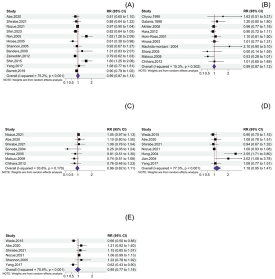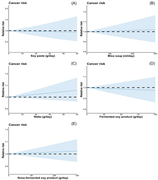 A total of twelve soy paste studies, ten miso soup studies, seven natto studies, seven fermented soy product studies, and six non-fermented soy product studies were included in this meta-analysis. The pooled RRs for the highest consumption of soy paste, miso soup, natto, fermented soy products, and non-fermented soy products versus the lowest consumption categories were 0.99 (95% CI: 0.87, 1.13), 0.99 (95% CI: 0.87, 1.12), 0.96 (95% CI: 0.82, 1.11), 1.18 (95% CI: 0.95, 1.47), and 0.95 (95% CI: 0.77, 1.18) (Figure 4, Table 3). There was heterogeneity between studies on soy paste, fermented, and non-fermented soy products, but no heterogeneity between natto and miso soup studies. Although these soy products were not associated with a reduced risk of total cancer, the results were changed upon conducting a subgroup analysis. In terms of study type, the pooled results of the four case–control studies showed that high consumption of natto was associated with a reduced risk of total cancer (RR: 0.74; 95% CI: 0.58, 0.95), and the meta-regression results suggested that the study design might be the source of heterogeneity in natto studies (p-difference = 0.045). For cancer types, consuming large amounts of non-fermented soy products reduces the risk of gastric cancer, while consuming a lot of soy paste reduces the risk of breast cancer. Regarding geographic location, the pooled result from studies in China found that high consumption of fermented soy products may be associated with an increased risk of cancer. Finally, no significant difference was found in total cancer risk between men and women (p-difference > 0.05 for all comparisons). In the dose–response meta-analysis, all of these soy products showed a linear relationship with cancer risk (p for nonlinear = 0.48 for soy paste, 0.77 for miso soup, 0.19 for natto, 0.20 for fermented soy products, and 0.84 for non-fermented soy products), and no associations were found between high consumption of these soy products and cancer risk (Figure 5).