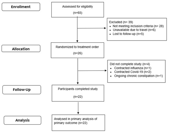 Twenty-six healthy adults met the inclusion criteria for the study and were randomized. Four participants did not complete the study: one person contracted influenza, two people contracted COVID-19 and one person did not commence the intervention as they were experiencing chronic constipation (Figure 1). A total of 22 participants completed the cross-over study (9 men, 13 women). Faecal samples from the 22 participants were used for the 16S sequencing; however, due to sample loss, DNA samples from only 20 participants were used for the qPCR assay for quantifying the BCoAT gene levels. The study participants were 43 ± 5 years of age, weighed 72 ± 11 kg and had a body mass index of 24 ± 3 kg/m2. All data obtained from these individuals were analyzed.