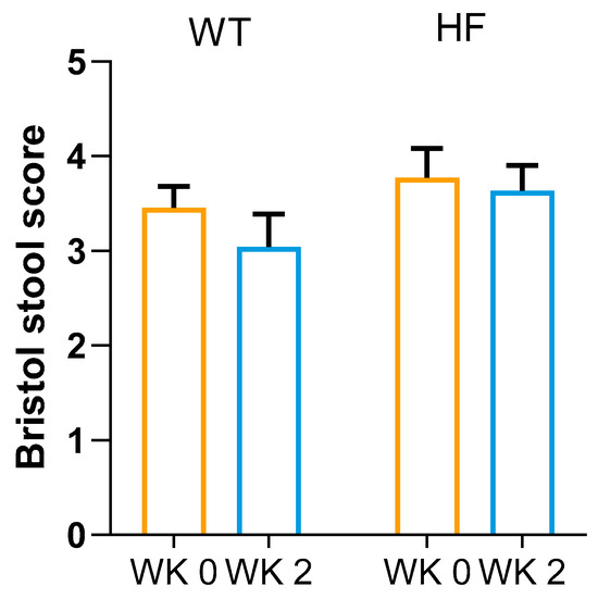 Bristol stool rating. Data are expressed as means ± SDs. Paired Student’s t-test (n = 22). WT, white bread; HF, high-fibre bread.