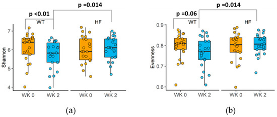 Changes in alpha diversity of faecal microbiota. (a) Changes in Shannon index. (b) Changes in Pielou’s evenness. Data presented as medians and inter-quartile ranges (n = 22). p-values from Wilcoxon signed-rank tests are displayed.