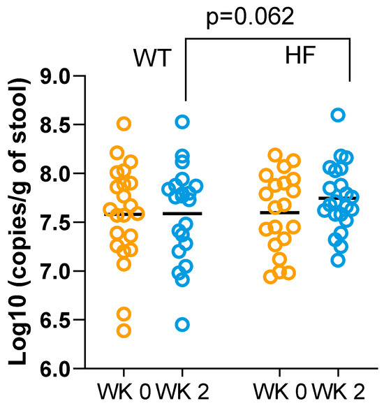 To further investigate the effect of high-fibre bread with respect to increasing the butyrate-producing capability of the gut microbiota, we quantified the levels of BcoAT genes—marker genes for butyrate synthesis in the human colon. Extracted DNA from the faecal samples of 20 participants was used for the absolute quantification of BcoAT genes using qPCR. Again, the high-fibre bread tended to increase the level of BcoAT genes compared to white bread (Figure 5), but the group differences were not significant (mean ± SD, HF 7.05 ± 0.34 vs. WT 6.89 ± 0.49, log10 copies/g of stool, p = 0.062).