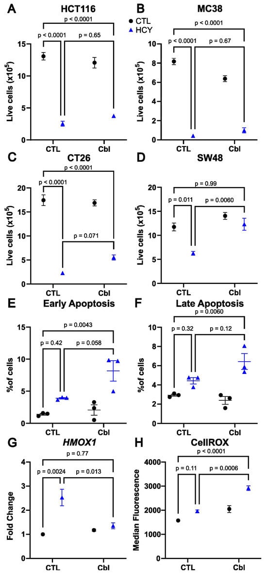 Cobalamin rescues SW48 cells without changes in apoptosis or oxidative stress. Live cell number at 48 h in HCT116 (A), MC38 (B), CT26 (C), and SW48 (D) colorectal cancer cells. Percentage of cells undergoing early (annexin V positive, PI negative; (E), and late apoptosis (Annexin V positive, PI positive; (F) and HMOX1 gene expression (G) and CellROX oxidative stress reporter assay (H) in SW48 cells. CTL: Control, Cbl: cobalamin, HCY: homocystine (Blue). Two-way ANOVA with Šídák’s multiple comparison test; standard error of mean and three of the six comparisons shown.
