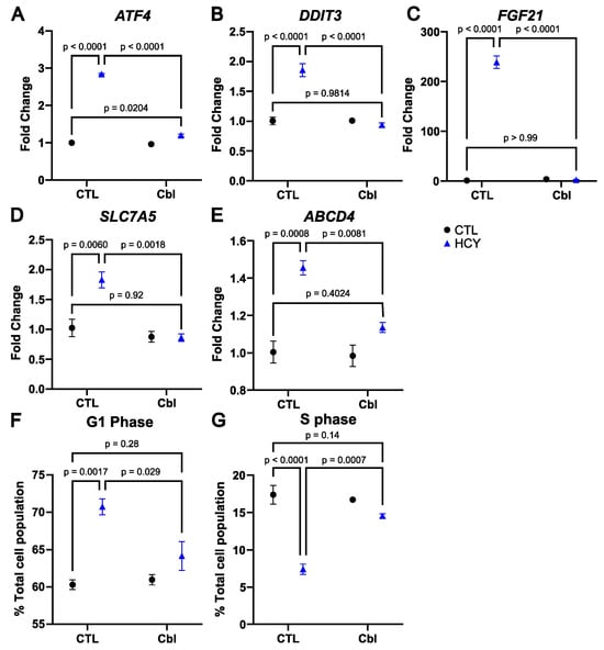 Cobalamin prevents the activation of the integrated stress response and restores the cell cycle in SW48 cells. Expression of the genes ATF4 (A), DDIT3 (B), FGF21 (C), SLC7A5 (D), and ABCD4 (E). Percentage of the total cell population in G1 phase (F) and S phase (G). CTL: Control, Cbl: cobalamin, HCY: homocystine (Blue). Two-way ANOVA with Šídák’s multiple comparison test; standard error of mean and three of the six comparisons shown.