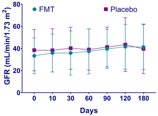 Mean baseline leukocytes levels were higher in patients in the FMT group compared to the placebo group (8.72 vs. 6.81 K/uL, p = 0.01, Table 1). Increased leukocytes values continued in the FMT group compared to the placebo group after days 10, 30 and up to 120 (p < 0.05, Supplementary Table S1). Glucose levels also increased in the FMT group after day 90 (123.39 vs. 99.54 mg/dL, p = 0.04, Supplementary Table S1) and up to 180 days post-treatment (127.23 vs. 94.85 mg/dL, p = 0.02, Supplementary Table S1). Blood urea nitrogen showed differences only on day 10 after treatment and was higher than the placebo group (40.93 vs. 30.31 mg/dL, p = 0.04, Supplementary Table S1). Uric acid baseline levels were also higher in the FMT group (7.79 vs. 6.27 mg/dL, p = 0.02), which decreased from day 10 to day 180 (p = 0.02) compared to the placebo group (6.21 vs. 7.28 mg/dL, p = 0.04, Supplementary Table S1). CRP was higher in the FMT group compared to the placebo group on day 120 (0.88 vs. 0.57 mg/dL, p = 0.04, Supplementary Table S1). In contrast, mean baseline bicarbonate (HCO3) values were lower in the FMT group compared to the placebo group (22.98 vs. 26.32 mEq/L, p = 0.008), which continued to day 60 (20.99 vs. 24.46 mEq/L, p = 0.002, Supplementary Table S1) and to day 180 (20.85 vs. 24.54 mEq/L, p = 0.01, Supplementary Table S1). Hemoglobin, platelets, 24-h urine protein, creatinine clearance, serum creatinine, potassium, and phosphorus levels did not show statistical differences between the groups throughout the study. From baseline to day 180, 24-h urine protein increased slightly in the FMT group (2.05 vs. 3.01 g/24 h) compared to the placebo group (1.67 vs. 2.34 g/24 h) and phosphorus levels increased in the placebo group (4.14 vs. 4.39 mg/dL) unlike in the FMT group (4.20 vs. 4.22 mg/dL), although not statistically. The COOP/WONCA test for quality of life did not show differences between the groups. The GFR was lower in the placebo group compared to the FMT group, although not statistically. The estimates of the GFR of patients in the FMT group showed a tendency to increase from the baseline to day 180 (average 34.58 vs. 41.23 mL/min/1.73 m2), suggesting lower CKD progression. Instead, the estimates of the GFR of patients in the placebo group did not show a tendency to increase (average 38.43 vs. 39.61 mL/min/1.73 m2), suggesting CKD progression. In particular, the progression of CKD expressed as a decrease in the GFR > 1 mL/min/1.73 m2 was noted in two (13.3%) patients treated with FMT compared to seven (53.8%) patients in the placebo group (p = 0.04, Figure 2).