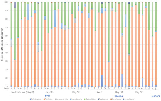 Average bacterial composition at the Phylum level. Stool samples from patients (n = 8) subjected to fecal microbiota transplantation (FMT) or placebo (n = 6) treatments were collected before (Day 0) and 30 (Day 30) and 90 (Day 90) days after treatment. After metagenomic analysis, distribution of bacterial composition at the phylum level was assessed and compared in both groups. The distribution of FMT donors was also compared.