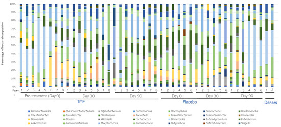 Average bacterial composition at the Genera level. Stool samples from patients (n = 8) subjected to fecal microbiota transplantation (FMT) or placebo (n = 6) treatments were collected before (Day 0) and 30 (Day 30) and 90 (Day 90) days after treatment. After metagenomic analysis, distribution of bacterial composition at the Genera level was assessed and compared in both groups. The distribution of FMT donors was also compared.