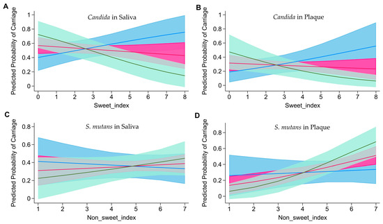 (A) The relationship between sweet index scores and predicted probability of Candida carriage in saliva at 12, 18, and 24 months. (B) The relationship between sweet index scores and predicted probability of Candida carriage in plaques at 12, 18, and 24 months. (C) The relationship between non-sweet index scores and predicted probability of S. mutans carriage in saliva at 12, 18, and 24 months. (D) The relationship between non-sweet index scores and predicted probability of S. mutans carriage in plaques at 12, 18, and 24 months. The blue line represents the relationship at 12 months and the blue area represents the confidence interval; the red line represents the relationship at 18 months and the red area represents the confidence interval; and the green line represents the relationship at 24 months and the green area represents the confidence interval.