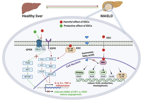 Genomic and non-genomic signaling of EDCs towards MASLD. The genomic signaling takes place in the nucleus, where EDCs bind to NRs as such PPAR, PXR, LXR that bind to RXR or directly to AHR, ER, AR, and PR and promote gene transcription. This way, EDCs are antagonising physiological ligands, fatty acids, or hormones, resulting in the enhancement or inhibition of hepatic steatosis. The non-genomic signaling mainly involves GPERs that are activated by EDCs, activating EGFR, and promoting MAPK or the PI3K/AKT pathways. This leads to induction of gene transcription, leading to production of inflammation-related cytokines, such as IL-6 and TNFa, promoting IR and associated diseases. In addition, ER, AR, or PR receptors can be activated in the cytoplasm by EDCs and promote the aforementioned pathways. On the contrary, some EDCs such as phytoestrogens have cytoprotective effects, and they can inhibit the PI3K/AKT pathway, resulting in reduced transcription of the mRNA of HIF1-α and VEGF genes, both known to promote angiogenesis. EDCs; endocrine disrupting chemicals, NRs; nuclear receptors, PPAR; proliferator-activated receptors, PXR; pregnane X receptor, LXR; liver X receptor, RXR; retinoid X receptor, AHR; aryl hydrocarbon receptor, ER; oestrogen receptor, AR; androgen receptor, PR; progesterone receptor, GPER; G protein-coupled estrogen receptor, EGFR; epidermal growth factor receptor, MAPK; mitogen-activated protein kinase, PI3K/AKT; phosphoinositide 3-kinase, IL-6; interleukin 6, TNFa; tumor necrosis factor a, HIF1-α; hypoxia-inducible factor 1-alpha, VEGF; vascular endothelial growth factor. Created with BioRender.com, accessed on 5 April 2024.