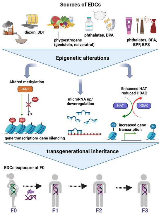 Transgenerational inheritance. In this figure, the most prominent sources of EDCs are presented. Exposure to these chemicals during the gestational period, childhood, or later in life is linked to produced epigenetic alterations, such as altered methylation, microRNA regulation, and histone acetylation. The aforementioned epigenetic alterations can be really penetrative across generations. DDT; dichlorodiphenyltrichloroethane, BPA; bisphenol A, BPF; bisphenol F, BPS; bisphenol S, DNMT; DNA methyltransferase, HAT; histone acetyltransferases, HDAC; histone deacetylases. Created with BioRender.com, accessed on 5 April 2024.