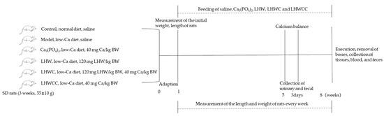 Male SD rats (n = 48, 3 weeks old, 55 ± 10 g) were purchased from the Vital River Laboratory Animal Technology Co., Ltd. (Beijing, China). The animal experimental protocol was approved by the Animal Ethics and Welfare Committee of Jiangnan University (Wuxi, China), and the IACUC Issue No. was JN.No 20230530S1200730[247]. Animal feeding conditions met SPF level requirements, and during the entire experimental period, rats were free to eat commercial food, which was prepared according to the AIN-93 [19] (normal diet: 5000 mg Ca/kg; low-calcium diet: 1000 mg Ca/kg) [10], and drink freely. At the beginning of the experiment, the initial body length, body weight, and tail length were measured. During a 7-week experiment, the length and weight of rats were measured every week. The rats in the control group were fed the normal diet and the remaining rats were fed a low-Ca diet. The rats were randomly assigned into six groups, and the details of the experimental design are shown in Figure 1.