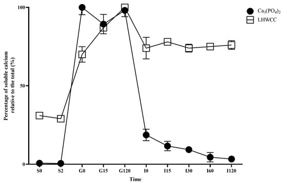 Changes in percentage of soluble calcium (relative to the total of calcium) for Ca3(PO4)2 and LHWCC during in vitro digestion.
