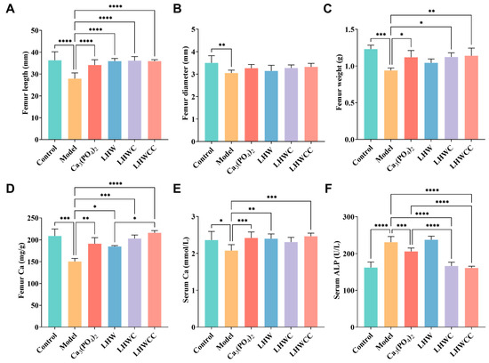 Changes in the bone morphology and calcium content and serum biochemical parameters of rats (A), femur length (B), femur diameter (C), femur weight (D), femur calcium (E), serum calcium (F), serum ALP. Data are expressed as the mean ± SD (n = 8). * p < 0.05; ** p < 0.01; *** p < 0.005; **** p < 0.001.