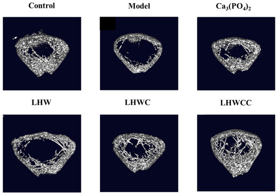 The three-dimensional (3D) reconstruction of micro-CT images of the left femoral trabecular bone is shown in Figure 5. Compared with the control group, the bone trabeculae of low-calcium rats were sparse, with large gaps and obvious damage in their morphology and network connectivity structure. Supplementation with Ca3(PO4)2, LHWC, and LHWCC all resulted in a significant effect on the bone trabeculae and an increase in thickness and connectivity, with LHWCC as the improvement of the microstructure of bone trabeculae and enhancing bone quality. On the other hand, LHW only showed a weak influence on the morphology of bone trabeculae.