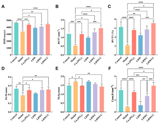Low calcium treatment significantly reduced the thickness and the connectivity density (p < 0.001) and increased the separation of bone trabeculae (p < 0.05) (Figure 6D–F) as indicated by indexes such as Th.Tb (an indicator of the thickness of the trabecular bone), Th.Sp (an indicator of the bone trabecular separation), and Conn.D (an indicator of the degree of trabecular bone separation). Both Ca3(PO4)2 and LHWCC showed significant effects on promoting bone trabeculae. The coadministration of LHW and Ca3(PO4)2 had a significant effect on restoring Th.Tb (p < 0.05) and Conn.D (p < 0.005), with no effect on Th.Sp, whereas no influence on bone trabeculae was recorded by LHW treatment.