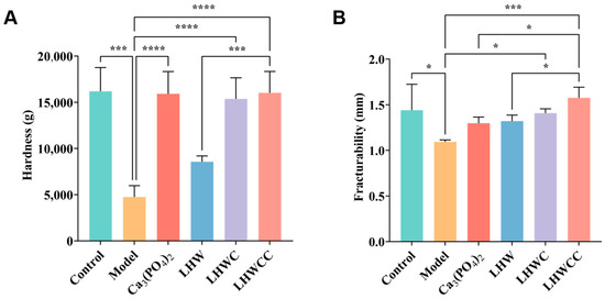 From Figure 7, it can be seen that low calcium intake resulted in significant decreases in the maximum bone load (p < 0.005) and maximum deflection. Supplementation with Ca3(PO4)2, LHWC, and LHWCC significantly improved bone biomechanics (p < 0.001) in rats, whereas LHW showed no effect. There was no significant difference between the regulating effect of Ca3(PO4)2 and LHWCC on hardness, whereas LHWCC performed better than Ca3(PO4)2 in fracturability.