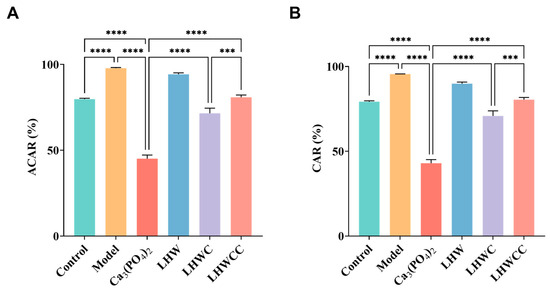 From Figure 8, it can be seen that the apparent calcium absorption rate (ACAR) and calcium accumulation rate (CAR) of the model group were significantly increased compared to the control group (p < 0.001), which might be due to pathological compensation formed to maintain calcium concentration in the body in a calcium-deficient state [5]. Ca3(PO4)2 treatment significantly decreased both ACAR and CAR. Although LHW treatment did not result in changes in calcium balance, the combination of Ca3(PO4)2 with LHW showed higher calcium absorption rates than that of Ca3(PO4)2 alone (p < 0.001), indicating that LHW could promote the absorption and accumulation of inorganic calcium in rats. When LHW was chelated with calcium, its apparent absorption rate increased to 80%, indicating that the chelation had a beneficial effect on calcium absorption and retention in calcium-deficient rats compared to inorganic calcium in the body [28], which is consistent with the pattern of calcium release of Ca3(PO4)2 and LHWCC during in vitro digestion.