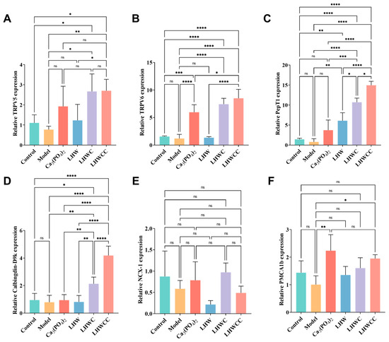 Calcium absorption-related gene expression in intestines of rats (A), TRPV5 (B), TRPV6 (C), PepT1 (D), Calbinding-D9k. (E), NCX-1 (F), PMCA1b. Data are expressed as the mean ± SD (n = 8). ns p > 0.05; * p < 0.05; ** p < 0.01; *** p < 0.005; **** p < 0.001.