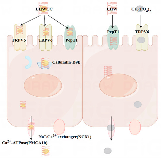 The small intestine is the main organ responsible for calcium absorption, responsible for over 90% of calcium absorption in the human body [29]. The process of calcium absorption in intestinal cells can be roughly divided into three steps: calcium ions enter the cells through TRPV5/6; calcium binds to Calbindin-D9k for intracellular transport; it is pumped into the bloodstream by NCX-1 and PMCA1b. The main rate-limiting step of the above process is to absorb calcium into cells, which means that the efficiency of active calcium transport is mainly related to channel proteins such as TRPV5/6 [7]. As shown in Figure 10, both LHWCC and CPPH-Ca exerted promotive effects on calcium absorption via regulation of the gene expression of TRPV5, TRPV6, Calbinding-D9k, and PMCA1b. In addition, it is reported that peptide calcium chelates can resist gastric digestion as short peptides enter the intestine. The main pathways currently known to transport peptides through the intestinal cells are the PepT1 pathway and the cell-penetrating peptide pathway, both of which are transcellular pathways. The PepT1 pathway is a widely specific peptide transporter protein that can transport almost all dipeptides and tripeptides [4]. The results have shown that LHWCC also regulated the higher expression level of PepT1 than Ca3(PO4)2 and LHWC, which would facilitate the transition of peptides into the intestine and contribute to the enhancement of calcium absorption indirectly due to the increased proportion of oligopeptides in protein hydrolysates after chelating with calcium [42]. Therefore, among the various calcium chelates, protein hydrolysate-calcium chelates are unique as they could upregulate not only the pathway of calcium absorption such as TRPV5, TRPV6, and Calbinding-D9k, but also an indirect pathway potentially beneficial for bone health via PepT1.