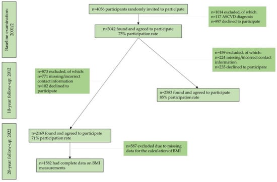 During 2001–2002, 4056 adults from the region of Attica, Greece were randomly invited to participate in the study. The sample selection was random and stratified by age, sex, and region, based on the 2001 census. Initially, participants were reached by telephone calls, letters, or home visits. Afterwards, 3042 adult men and women, who suited the study criteria, agreed to participate in the baseline examination and were, thus, recruited in the study. Trained health professionals assessed these participants’ characteristics through face-to-face interviews. Of the 3042 initial participants, 2583 were found at the 10-year follow-up (85% participation rate), and 2169 participants were found at the 20-year follow-up (71% participation rate) (Figure 1). Almost half of the individuals lost to follow-up were not found because of missing or wrong addresses and telephone numbers and the rest because they declined to be re-examined. After excluding participants with missing values on the BMI measurements, the sample for the current analyses consisted of 1582 participants (Figure 1). No significant differences were observed between this sample and the baseline sample, regarding the distribution of age and sex (p-value > 0.05).