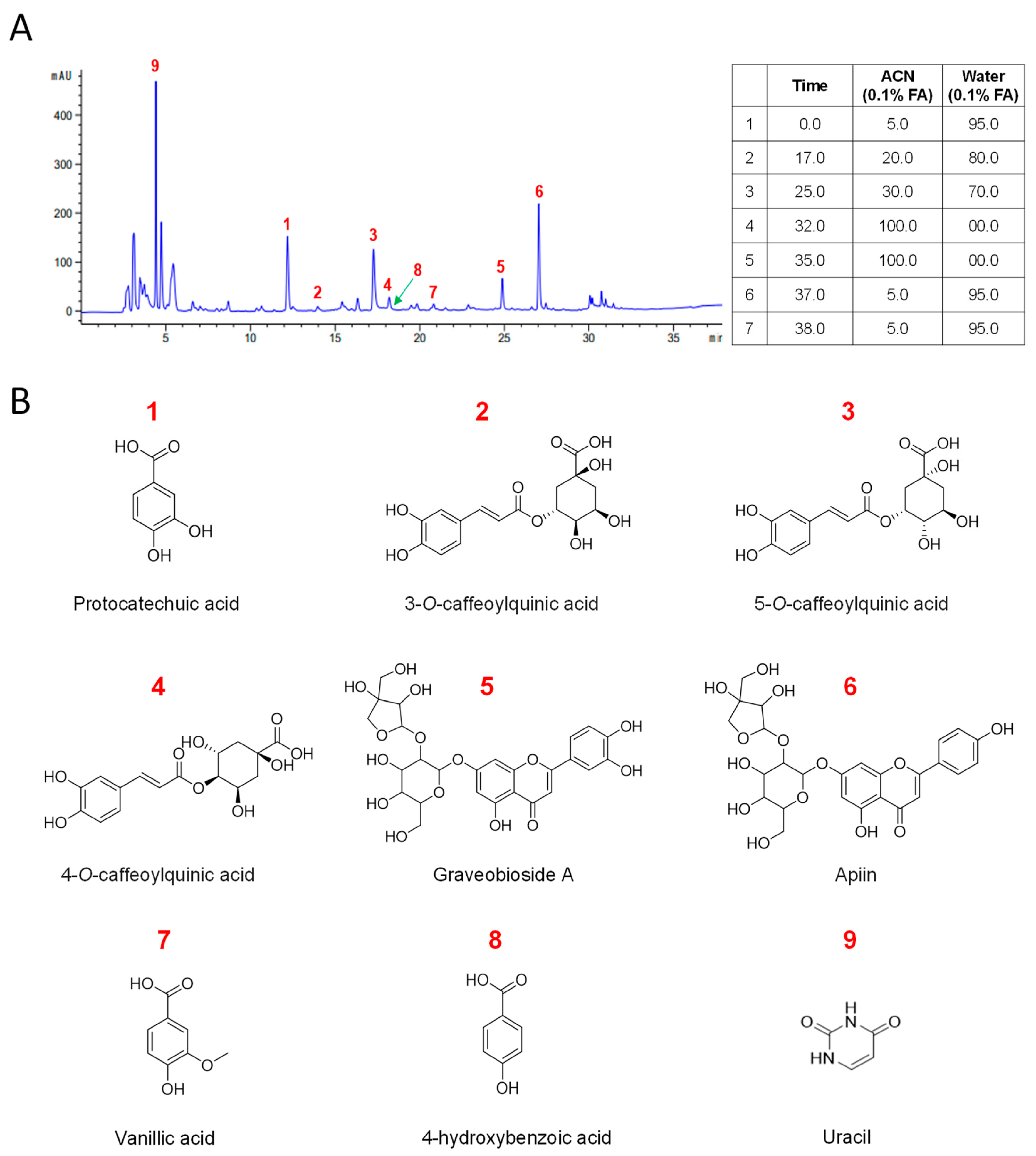 - Liu, G.Y.; Zhuang, L.W.; Song, D.D.; Lu, C.L.; Xu, X. Isolation, purification, and identification of the main phenolic compounds from leaves of celery (Apium graveolens L. var. dulce Mill./Pers.). J. Sep. Sci. 2017, 40, 472–479. [Google Scholar] [CrossRef]