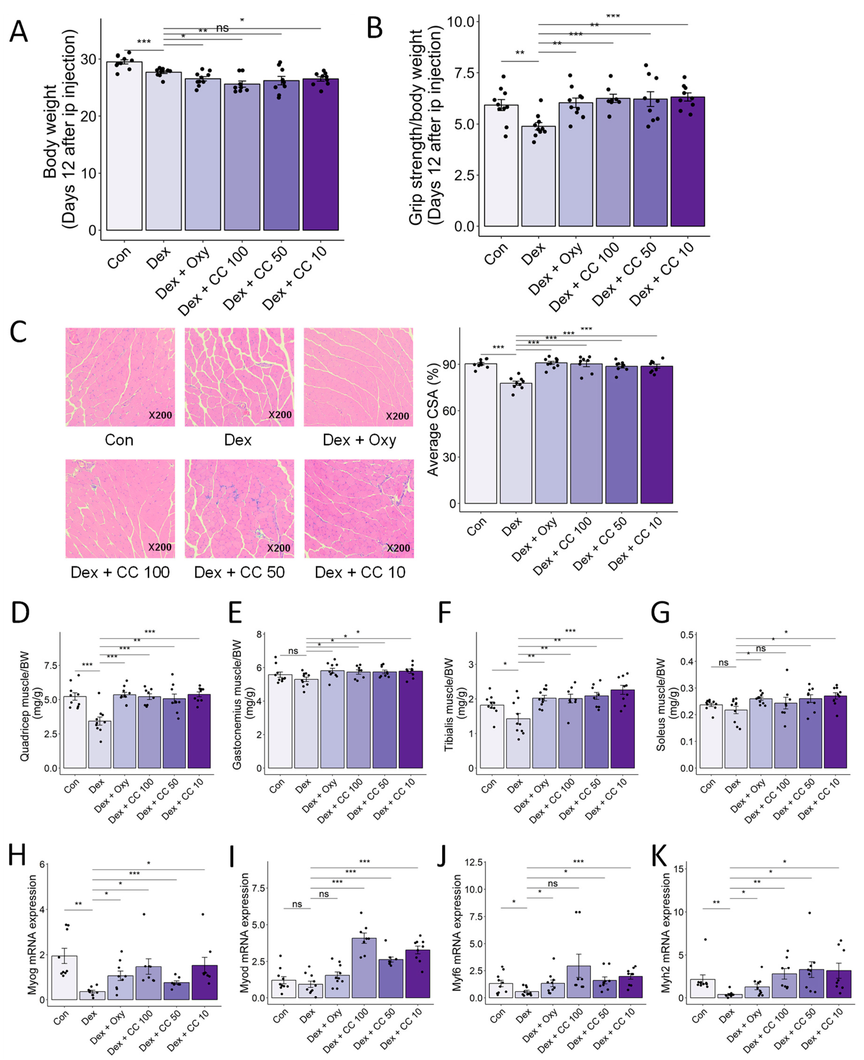 3.6. CC Ameliorates DEX-Induced Muscle Atrophy in a Murine Mode