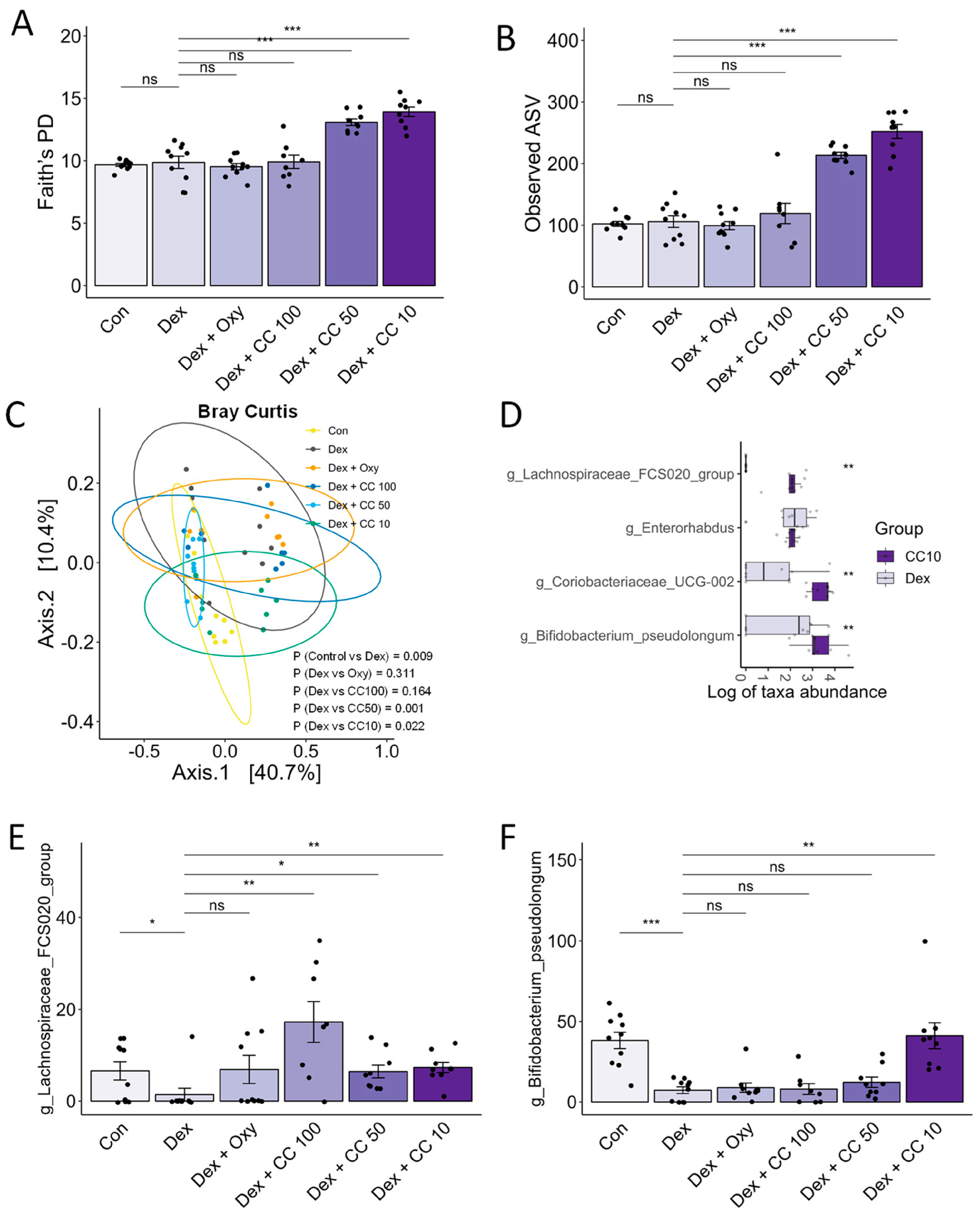 3.8. CC Modulates Gut Microbial Diversity and Composition, Reversing DEX-Induced Dysbiosis