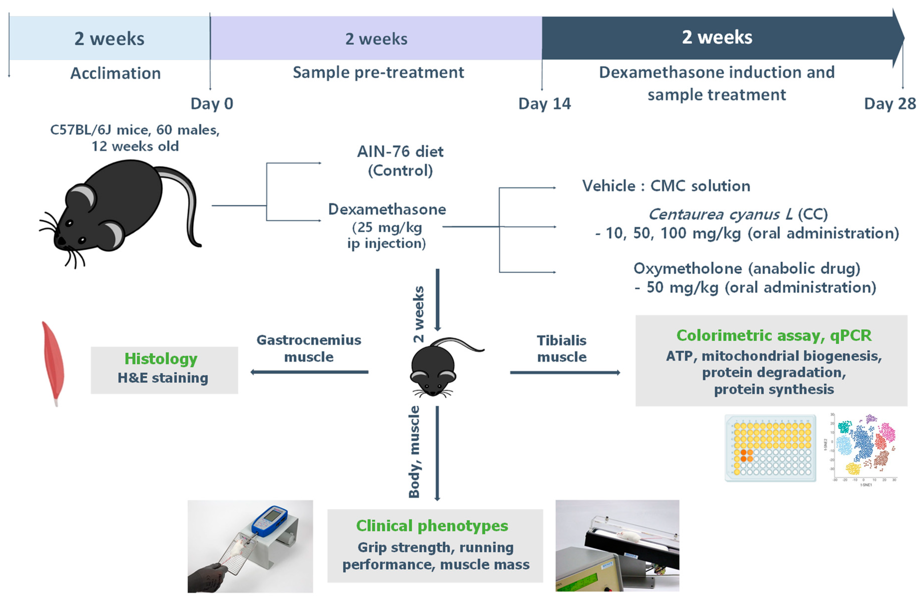 Nguyen NB, Le TT, Kang SW, Cha KH, Choi S, Youn H-Y, Jung SH, Kim M. Cornflower Extract and Its Active Components Alleviate Dexamethasone-Induced Muscle Wasting by Targeting Cannabinoid Receptors and Modulating Gut Microbiota. Nutrients. 2024; 16(8):1130. https://doi.org/10.3390/nu16081130