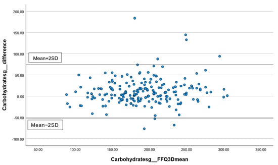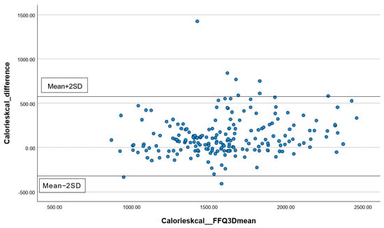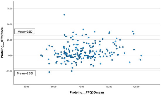 The differences in the measurements of total energy (Figure 1), protein (Figure 2), carbohydrates (Figure 3), and total fat (Figure 4) between the FFQ1 and three-day dietary records were visualized using Bland–Altman plots. A total of nine outliers can be observed in both Figure 1 and Figure 3. In Figure 2, 13 outliers are identified, and 11 outliers are depicted in Figure 4. The Bland–Altman analysis results for the remaining nutrient parameters are summarized in Table S1. The percentage of outliers for the nutrients ranged from 3.03% (zinc) to 7.07% (calcium). To better illustrate the limit of agreement between the short FFQ and the three-day dietary records, Bland–Altman plots are provided in Figures S1–S16.