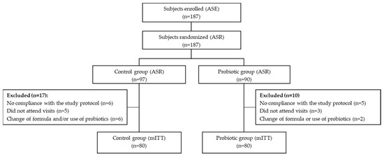 A flow chart including all the participants in this trial is shown in Figure 1. A total of 187 infants were enrolled in the study and randomized. Among them, 27 randomized subjects (10 PG, 17 CG) were excluded from the mITT population due to reasons specified in Figure 1. The baseline characteristics of the 160 infants (CG: 80: PG: 80) who fulfilled the whole intervention period and were therefore included in the mITT population were similar in both groups (Table 1).