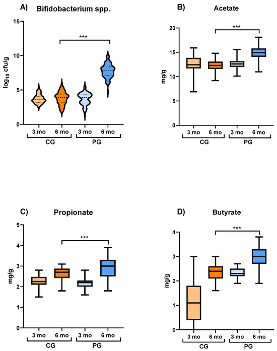 The fecal concentration of SCFA (butyrate, propionate, and acetate) was similar in both groups at baseline (acetate: CG: 12.48 ± 2.13 mg/g, PG: 12.58 ± 1.09 mg/g; propionate: CG: 2.26 ± 0.3 mg/g, PG: 2.21 ± 0.34 mg/g; butyrate: CG: 1.12 ± 1.36 mg/g, PG: 2.31 ± 0.3 mg/g), but were higher in the PG than in the CG at the end of the probiotic intervention (acetate: CG: 12.27 ± 1.5 mg/g, PG: 14.96 ± 1.68 mg/g; propionate: CG: 2.66 ± 0.38 mg/g, PG: 2.98 ± 0.77 mg/g; butyrate: CG: 2.38 ± 0.47 mg/g, PG: 3.0 ± 0.57 mg/g) (Figure 2B–D).