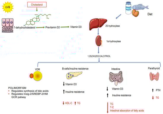 Li et al. demonstrated another important link between vitamin D and cholesterol trough VDR. Vitamin D deficiency reduces the transcriptional activity of VDR, leading to a down-regulation of insulin-induced gene-2 (Insig-2) expression and, consequently, the activation of its inhibitory effect on sterol regulatory element-binding protein 2 (SREBP-2). This cascade ultimately leads to an increase in 3-hydroxy-3-methylglutaryl-coenzyme A reductase expression, culminating in elevated cholesterol production [].