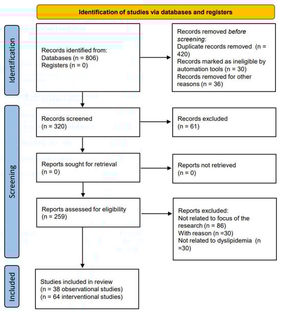 A literature review was conducted from inception to July 2023. The PubMed/Medline, Cochrane Library, ClinicalTrials.gov, and SCOPUS databases were searched using the following search terms: “dyslipidemia” or “cholesterol” or “lipids” or “triglyceride” AND “vitamin D”. The process of selecting the studies for review in adherence to the PRISMA 2020 process is shown in Figure 2.