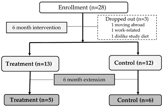 Twenty-eight participants were enrolled in this study, and three participants withdrew due to personal reasons such as moving abroad, work-related issues, or disliking the study diet. Study participants who were postmenopausal women between the ages of 50 and 64 (12 months of spontaneous amenorrhea, if the last menstrual period was less than 6 months to 1 year and blood follicular stimulating hormone (FSH) > 40 mIU/mL) with a body mass index of 18.5 to 30.0 kg/m2 were enrolled in this study. Subjects who had a T-score < −2.5 (the L1 to L5 lumbar spine average, femoral neck or total hip); had received calcium supplements, biophosphonate treatment, vitamin D supplements exceeding 200 IU per day, and hormone replacement therapy within 3 months prior to screening; whose aspartate aminotransferase (AST) or alanine aminotransferase (ALT) exceeded 120 U/L; whose creatinine exceeded 2.0 mg/dL; who were suspected of having abnormal thyroid function; who had thyroid stimulating hormone (TSH) levels outside the normal range, thyroid cancer or hyperfunction; or uncontrolled hypertension (>106/100 mmHg); or had uncontrolled diabetes (fasting blood sugar over 180 mg/dL, new medication added due to diabetes within 3 months); a history of malignancy; an esophageal disease that delays esophageal emptying; uncorrected hypercalcemia/hypocalcemia; uncontrolled chronic disease that can affect metabolism (chronic, liver diseases, alcoholism, primary hyperparathyroidism); drug treatment that affects bone or calcium metabolism (steroids, diuretics, etc.); or clinically significant diseases and egg allergy, were excluded from the study. Twenty-five subjects (13 in the treatment group, 12 in the control group) successfully completed the 6-month intervention, and 11 subjects (5 in the treatment group, 6 in the control group) who agreed to an extension for an additional 6 months completed the 12-month intervention.