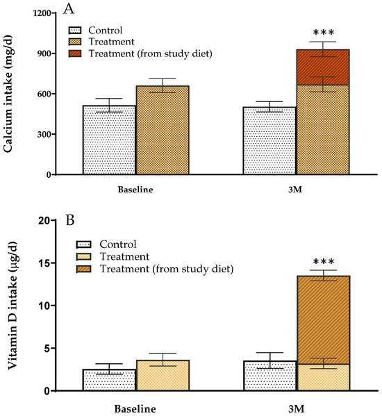 Calcium (A) and vitamin D (B) intake of study participants during the intervention period. Values are mean ± standard error and significant differences between groups were compared by non-parametric comparison using Mann–Whitney U test, *** p < 0.001. Calcium and vitamin D intake were determined by 3-day dietary records (two times on weekdays, one time on weekends). Study diets were analyzed by ICP-MS for calcium and LC-MS/MS for vitamin D.