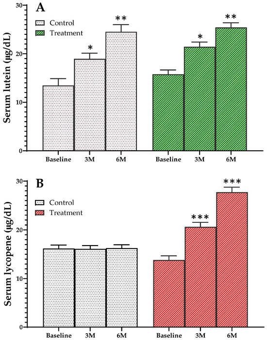 Changes in serum lutein (A) and lycopene (B) concentrations of study participants during the intervention period. Values are mean ± standard error and significant differences from baseline were compared by non-parametric comparison using Mann–Whitney U test, * p < 0.05, ** p < 0.01, *** p < 0.001.