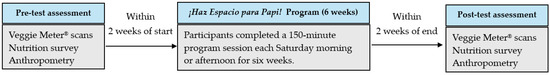 The timeline for Mexican-heritage fathers’ participation in the ¡Haz Espacio para Papi! (HEPP) Program. This figure shows the outcomes assessed in this manuscript pre-test and post-test. While anthropometry was assessed, this was not a program outcome. Data collection occurred at baseline (pre-test), within two weeks of the start of the program and program conclusion (post-test) within two weeks of the end of the program.