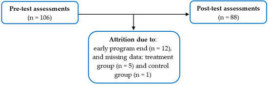 Fifty-nine fathers consented to participate in the program and completed pre-test assessments and were divided into groups 1–5 [12,27,31]. Four groups of 10–12 families completed the program in four sequential steps between July 2019 and January 2020. Due to the onset of the COVID-19 pandemic, families in group 5 only attended two sessions before the program was terminated. Therefore, participants from group 5 (n = 12) were excluded from data analyses. Five additional fathers from groups 1–4 were excluded from data analyses due to missing post-test data, leaving a total of 42 fathers in the treatment group. Forty-seven fathers from groups 2–5 served as wait-listed control comparisons during the study period. However, one control comparison with missing post-test data was removed from data analyses. Overall, a total of 106 pre-test and 88 post-test assessments were gathered from the treatment group and control comparisons (Figure 2). The retention of the treatment group participants and control comparisons at the post-test assessment was 83%.