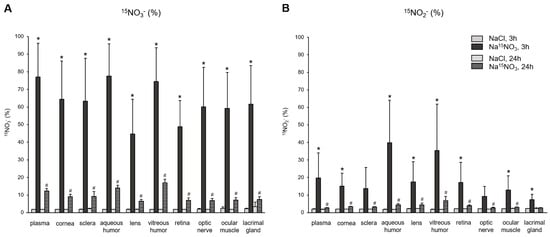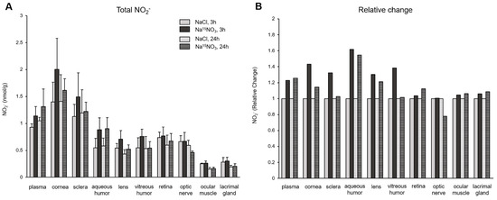 Total nitrite concentration (panel A) and its relative change (panel B) in porcine plasma and ocular tissues after Na15NO3 administration. (A) Tissue samples were homogenized using a bead homogenizer, then centrifuged (17,000× g, 30 min) after mixing with methanol for deproteinization [39]. The supernatant was used for nitrate measurement using a standard chemiluminescence method with tri-iodide [38]. Data are plotted as average ± standard deviation (n = 4 for 3 h groups, n = 3 for 24 h groups). N represents an individual animal. (B) The change in each tissue at 3 h and 24 h after Na15NO3 administration relative to NaCl administration.